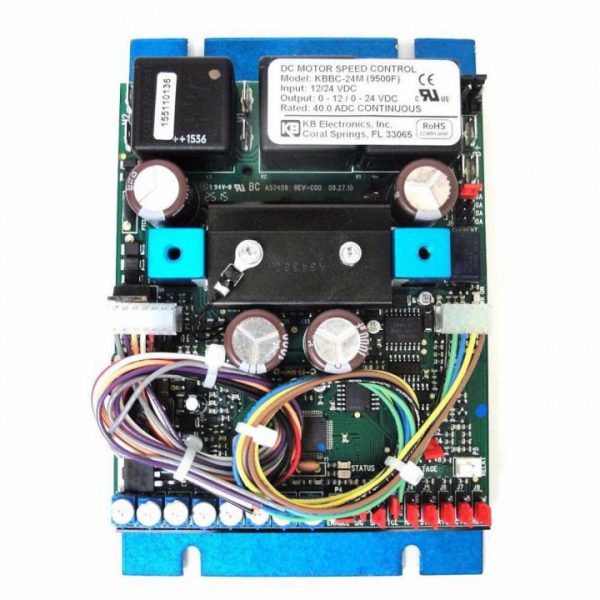 The KBBC series of battery powered variable speed controls are designed for PM and Series Wound DC motors from 1/100 to 4 horsepower. The chassis and Microcontroller design provides superior performance and ease of tailoring to specific applications. Operating in a regenerative mode, precise and efficient control is obtained using state-of-the-art MOSFET technology. The KBBC contains standard features such as current limit, short circuit protection, speed potentiometer fault detector, over-temperature sensing, reverse polarity protection and undervoltage/overvoltage protection. The KBBC can be controlled in several ways, such as single-ended or wigwag speed potentiometer and 0 – 5 Volts DC signal following. The controls contain a built-in heat sink that also serves as a mounting base.